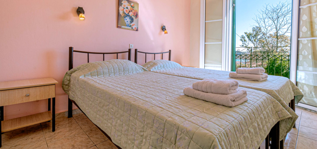 The natural colors in this room merge with the elegant furniture to create the perfect relaxing atmosphere for a summer getaway. The comfortable mattress and the various amenities offered provide you with everything you need for a carefree stay. Don’t miss out on the chance to unwind on your lovely terrace and breathe in the fresh air of the countryside in Corfu.